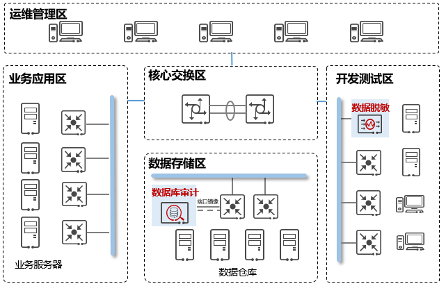 针对该公司需求,本次项目建设部署一套数据库审计系统和一套数据脱敏系统,数据库审计系统部署在数据存储区,通过交换机镜像端口引流至数据库审计系统进行协议解析还原;数据脱敏系统部署在开发测试区,通过直连数据仓库进行数据抽取、脱敏最终装载至开发测试服务器,部署架构如下图所示: