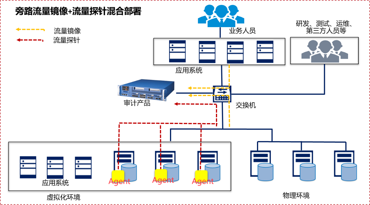 (一)同时支持流量镜像、流量探针模式混合部署部署;解决了虚拟化环境无法通过流量镜像获取访问数据的缺陷,从而使审计范围更全面。