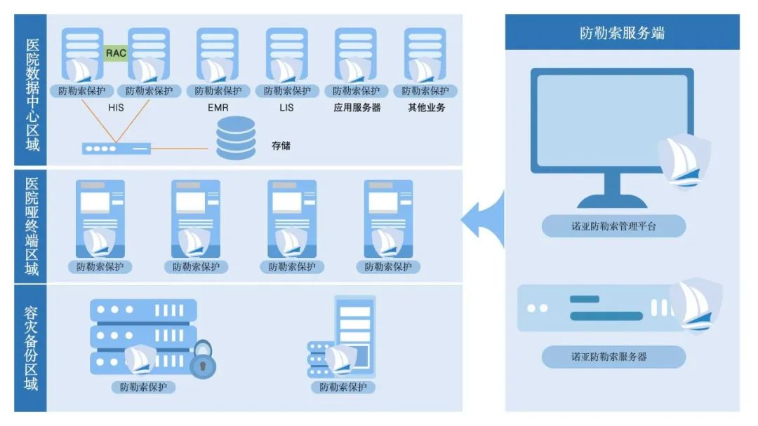 诺亚防勒索系统分为后台管理中心和前端代理,将后台管理中心部署在该医院数据中心区域的服务器上,设置固定的IP地址,保证能与终端客户端联网访问;在医院需要保护的重要服务器上,部署诺亚防勒索系统的前端代理客户端,实现对医院的重要服务器端的实时监控和保护。