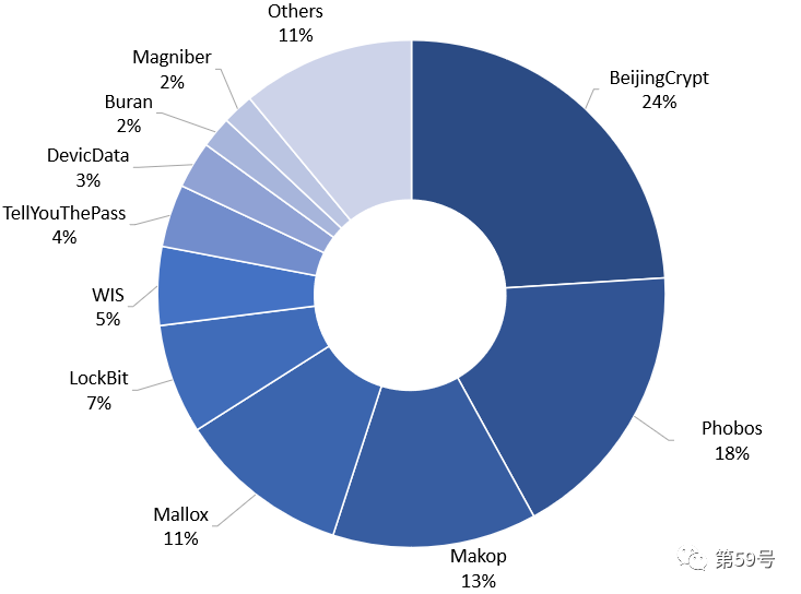 下图是beats365·(中国区)唯一官方网站第59号实验室对勒索病毒监测后所计算出的11月份勒索病毒家族流行度占比分布图。BeijingCrypt、Phobos、Makop三大勒索病毒家族的受害者占比最多。