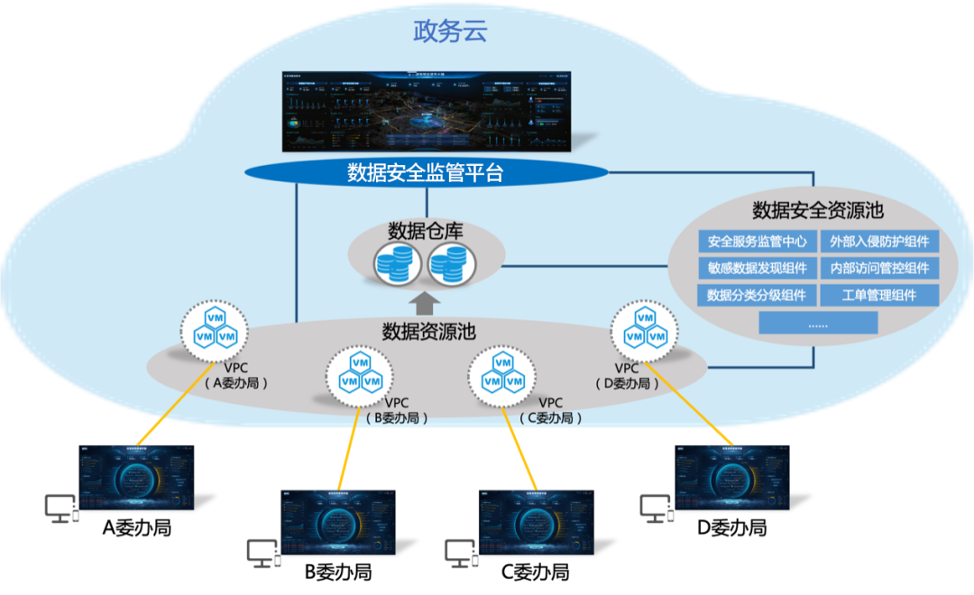 基于数据安全监管平台“多租户”模式,既保障委办局间数据隔离,又让安全能力触手可及: