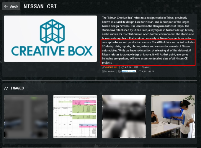 Qilin勒索软件组织近日在暗网声称攻破日产汽车旗下东京设计子公司Creative Box Inc.(CBI),窃取逾4TB数据(约40万份文件),并以此威胁公司满足其要求。泄露样本显示,数据涵盖汽车3D设计文件、财务与运营文档、照片视频及VR设计资料,其中包括车辆内饰高精度渲染图和虚拟现实设计流程。若消息属实,这些敏感信息一旦外泄,或将为竞争对手及造假者提供重要参考,给日产研发及商业机密带来重大风险。
