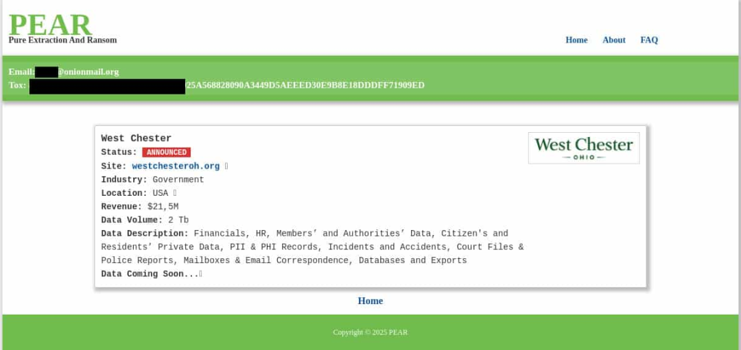 PEAR勒索组织称对本月初俄亥俄州西切斯特镇遭受的网络攻击负责。8月12日,西切斯特镇政府官员宣布,他们发现了一起网络安全事件。PEAR勒索组织在2025年8月15日声称对此次攻击负责,并表示窃取了2TB的数据,但西切斯特镇尚未证实PEAR的说法。两周后,该镇政府官员报告了该镇电子邮件服务器遭受的第二次攻击事件。8月26日,该镇表示已关闭电子邮件、电话和网站服务。据称,镇政府员工收到了勒索信。目前尚无勒索组织声称对第二次攻击事件负责。