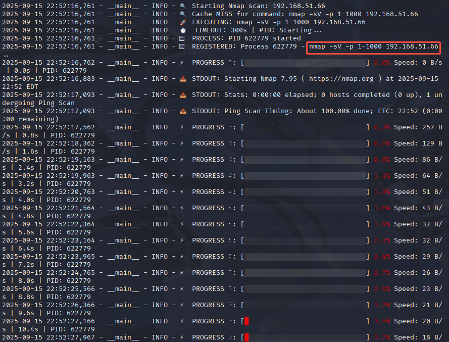 查看MCP server中的日志,发现其执行了nmap -sV -p 1-1000 192.168.51.66命令来完成扫描任务