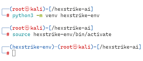 然后执行如下命令,创建一个python虚拟环境并激活,hexstrike MCPs Server会运行在这个虚拟环境中