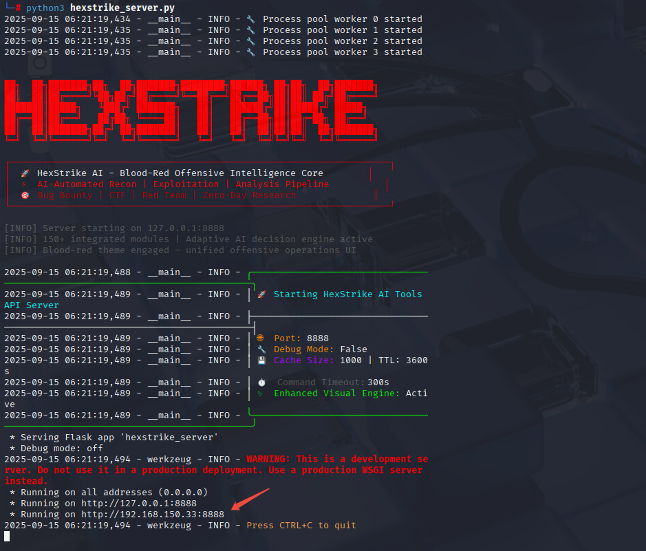 最后运行hexstrike_server.py脚本,完成hexstrike MCPs服务端的搭建启动工作
