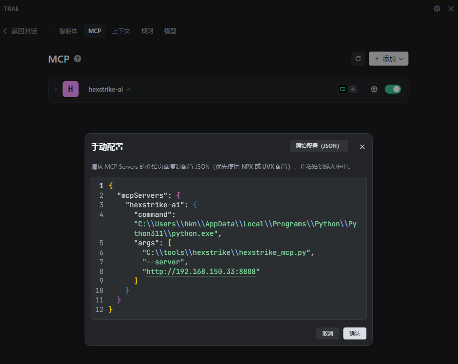 然后开始配置工具,主要就是配置命令这一项,需要配置客户端python的绝对路径、hexstrike_mcp.py的绝对路径以及上述MCP服务端地址,具体命令示例如下