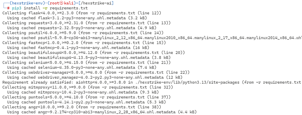 安装hexstrike MCPs Server所需要的依赖,安装过程中可能会因为网络问题或依赖版本问题出现报错,按照报错提示解决即可