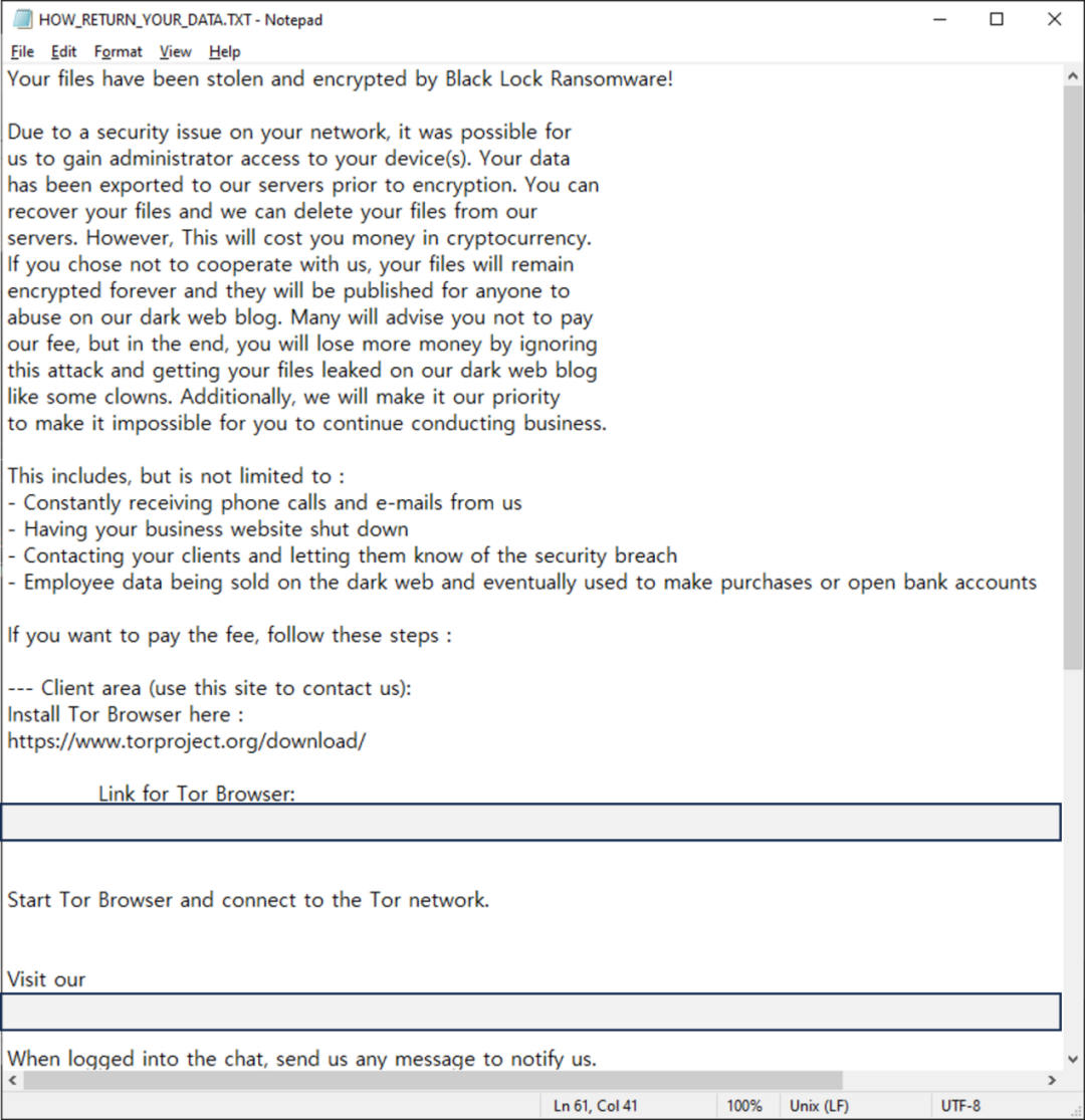 BlackLock是一个相对较新的勒索组织,成立于2024年3月左右。该组织最初使用的名称为“El Dorado”,并于2024年9月左右更名为“BlackLock”。BlackLock勒索软件用Go语言开发,该勒索软件似乎有一个针对VMware虚拟化平台ESXi的功能,即名为-esxi的参数。然而,研究人员在分析的样本中发现该参数的实际功能并未实现。该勒索软件为每个文件生成一个独特的加密密钥,并使用一个共享密钥进一步对这些密钥进行加密。被加密的文件会被添加随机的扩展名,其释放的勒索信名称为“HOW_RETURN_YOUR_DATA.TXT”。在Windows环境中,BlackLock勒索软件不仅攻击本地驱动器,还会对SMB共享文件夹进行攻击。