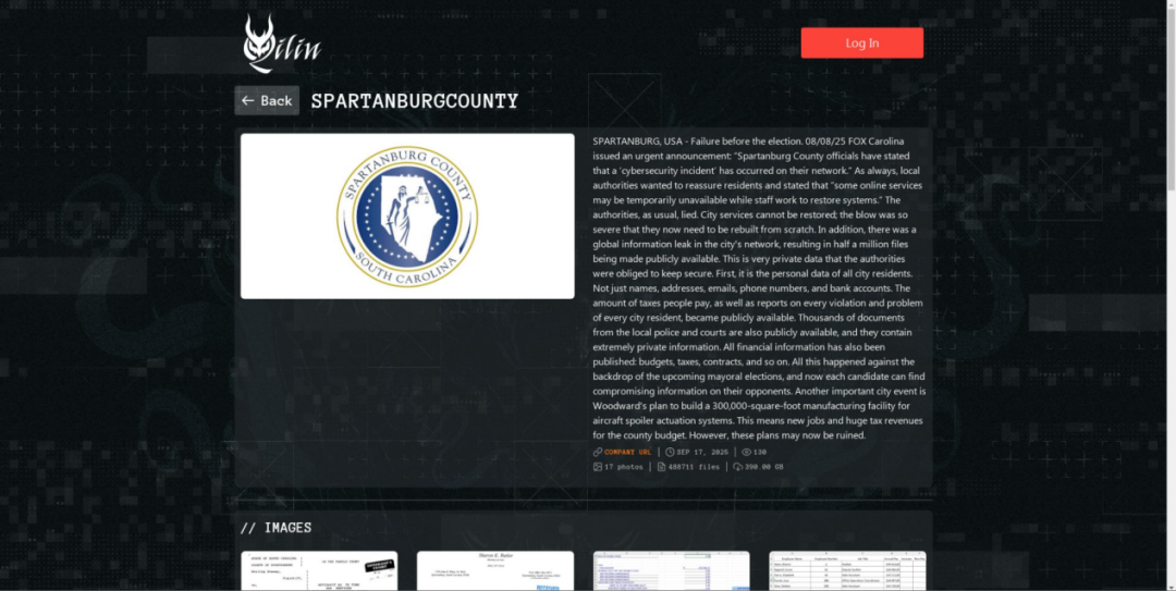Qilin勒索组织声称对南卡罗来纳州斯帕坦堡县(Spartanburg County)发起了攻击,并破坏了该县的公共服务。斯帕坦堡县于2025年8月8日称其系统遭受了一次网络攻击,导致数量有限的包含员工信息的入职文件遭到泄露。Qilin勒索组织在其数据泄露网站上发帖称,他们从斯帕坦堡县窃取了390GB的数据。斯帕坦堡县官员尚未证实Qilin勒索组织的说法。