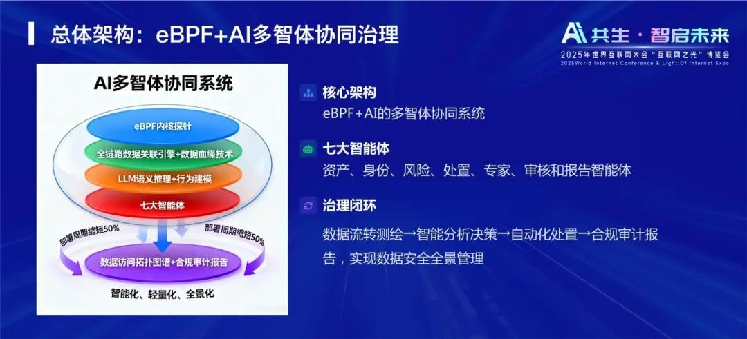 技术方案以“eBPF+AI”多智体协同架构为核心,构建了从数据感知到智能决策的全闭环治理体系。资产、身份、风险、处置、专家、审核、报告七大智能体协同,形成“数据流转测绘-智能分析决策-自动化处置-合规审计报告”的完整链路,让数据安全治理实现全景可视、全程可控。