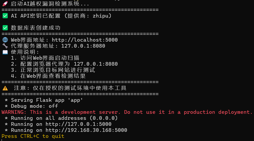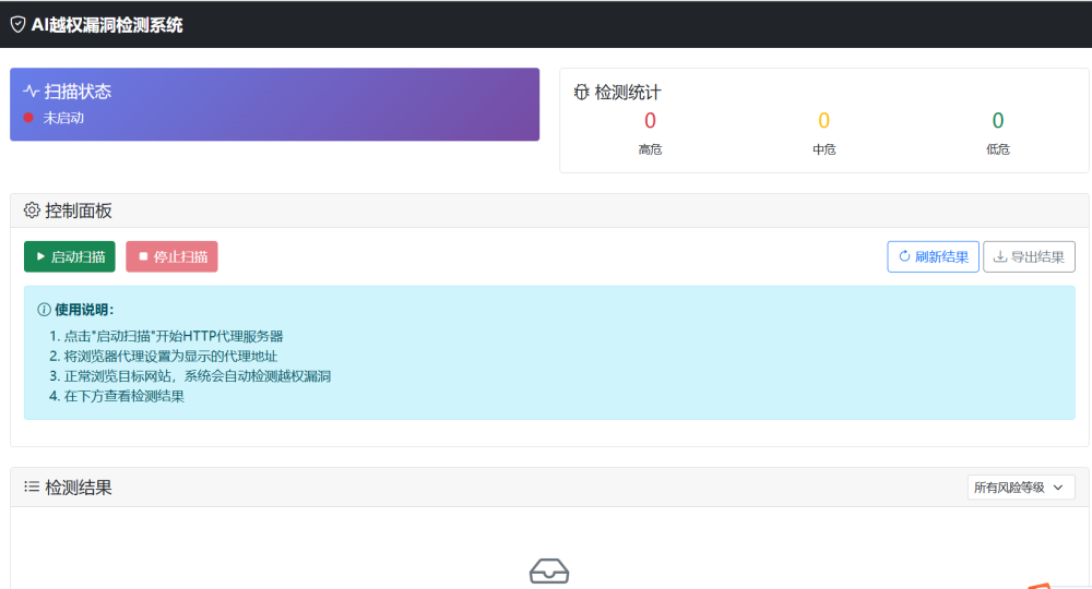启动检测系统,检测系统启动在5000端口,监听了一个8080端口的被动代理,待测应用只需要代理这个端口即可