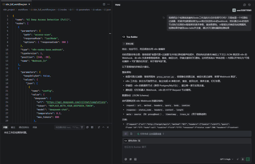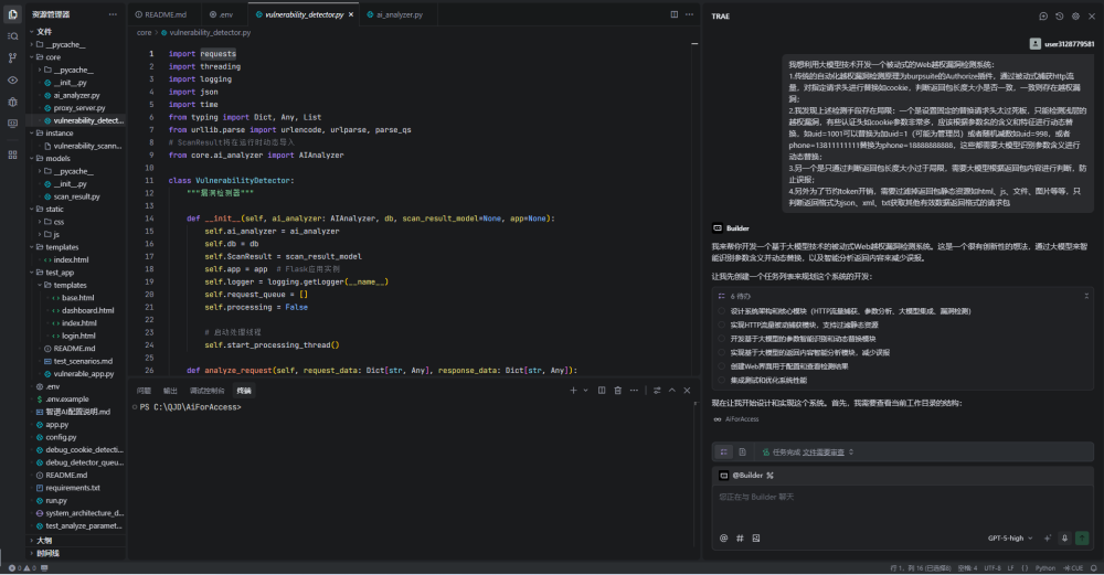 我们的目标是做一个水平越权检测系统,AI修改参数,重放,AI比对响应得出漏洞检测结果,既然目标清晰,就可以编写提示词让AI IDE(本文使用的是Trae)将整个系统实现出来,参考提示词: