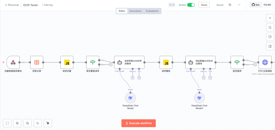 从上面流程可以看出,我们仅仅通过对话的方式,就让AI做出了一个“看起来可用”的Web水平越权漏洞检测系统,甚至对于如何修改参数、如何对比响应包的提示词都是AI自行编写的。但是全部使用AI完成这套流程存在一个比较麻烦的问题,就是维护和扩展只能依赖AI继续完成,自己和别人都无法很好的理解和扩展这段代码,最后可能变成一个“屎山”系统。那有没有更好的方式,既能完全使用AI大模型解放生产力又能更好维护呢,下面就用大模型配合原生AI工作流平台结合的方式进行探索。