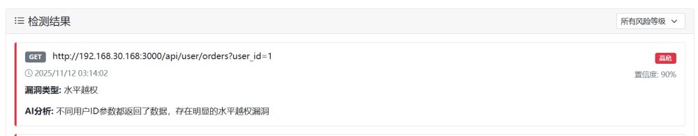 可以看到使用检测系统成功检测出了这个接口的水平越权漏洞