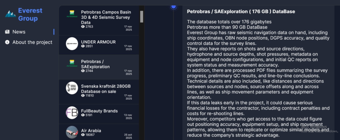 近日,Everest勒索软件组织在其暗网泄露网站上声称已成功入侵巴西国有石油公司Petrobras的系统,窃取了超过180GB的地震勘测数据。该组织在两份公告中指出,首批泄露的数据包含超过176GB的地震导航数据,其中90GB直接属于Petrobras。泄露的数据包括船舶定位、设备配置和深度测量等敏感信息,这些信息对石油和天然气行业至关重要,可能被竞争对手利用。Everest要求Petrobras在四天内通过加密通讯平台Tox与其联系,并设置了倒计时警告。Petrobras尚未对此事件作出公开回应。